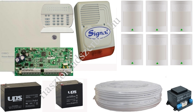 DSC1616 központ+5516 led kezelő, doboz, táp, 2db akku, 6db érzékelővel, 100m kábel.