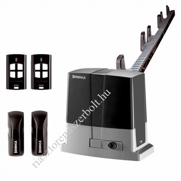 BENINCA - tolókapu szett , motor max 500kg kapusúlyig beépített vezérlőegységgel és rádióvevővel, 650N, 230Vac, 30% munka, 10,5m/perc sebesség, Esztétikus kivitel, gyalogos bejáró funkció, lassítás, kulcsos kioldás, 2db TO.GO4 adóval, pupilla fotocellával, 4 méter CRV6 fogasléccel