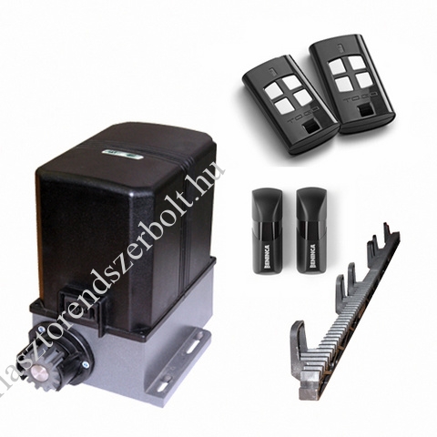 EUROMATIC - Tolókapu mozgató szett, max 500kg kapusúly, 30% munka, ECO-1 vezérlés, 2db TO.GO4 adóval, 1 pár PUPILLA fotocella, 230Vac, gyalogos bejáró funkció, lassítás, 4m CRV6 mûanyag fogasléc