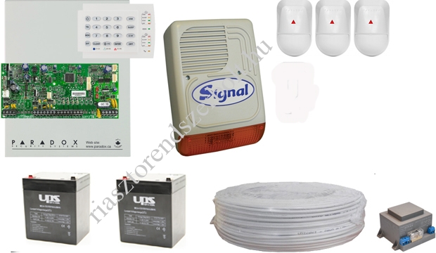 3 db infra, központ, kezelő, doboz, kültéri sziréna, 2 db akkumulátor, táp, 100m kábel. Ezt a PARADOX riasztórendszert igény esetén, külön árajánlat alapján fel is szereljük!