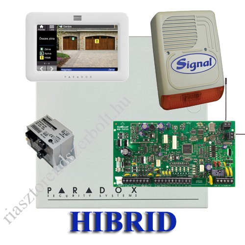 5 alaplapi zóna, duplázható 10-ig, bővítőkkel max.32 zónás rádiós hibrid riasztórendszer központ (2 partíció, 32 kód,) fehér TM50 érintőképernyős kezelő, fém doboz, 30VA tápegység, PS128 sziréna.