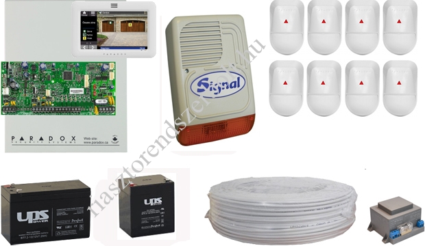 8 db infra, központ, érintőképernyős kezelő, doboz, kültéri sziréna, 2 db akkumulátor, táp, 100m kábel. Ezt a PARADOX riasztórendszert igény esetén, külön árajánlat alapján fel is szereljük!