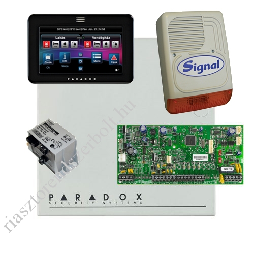 Paradox SP5500 riasztó központ 5 (32) zóna, 2 partíció, StayD, kommunikátor, 2 PGM, fémdoboz, TM50 fekete kezelővel, 30VA riasztórendszer tápegységgel, SIGNAL PS-128A kültéri szirénával.